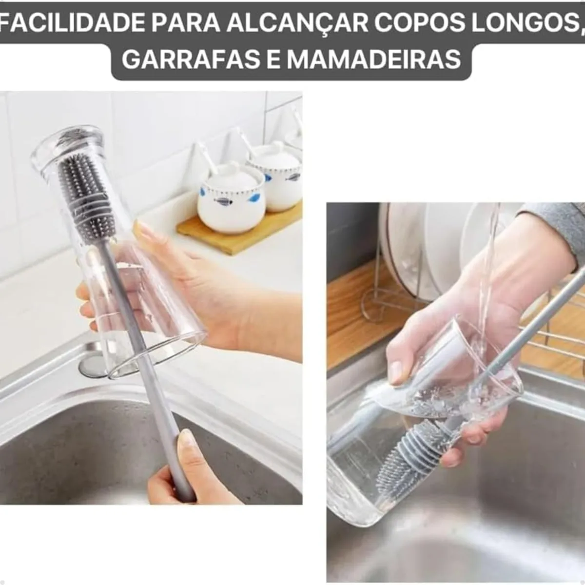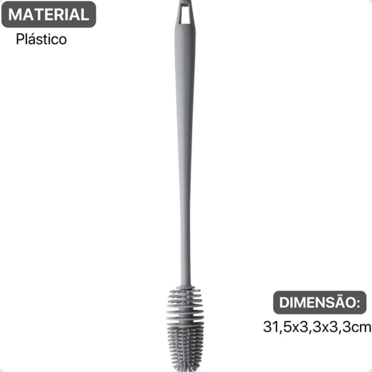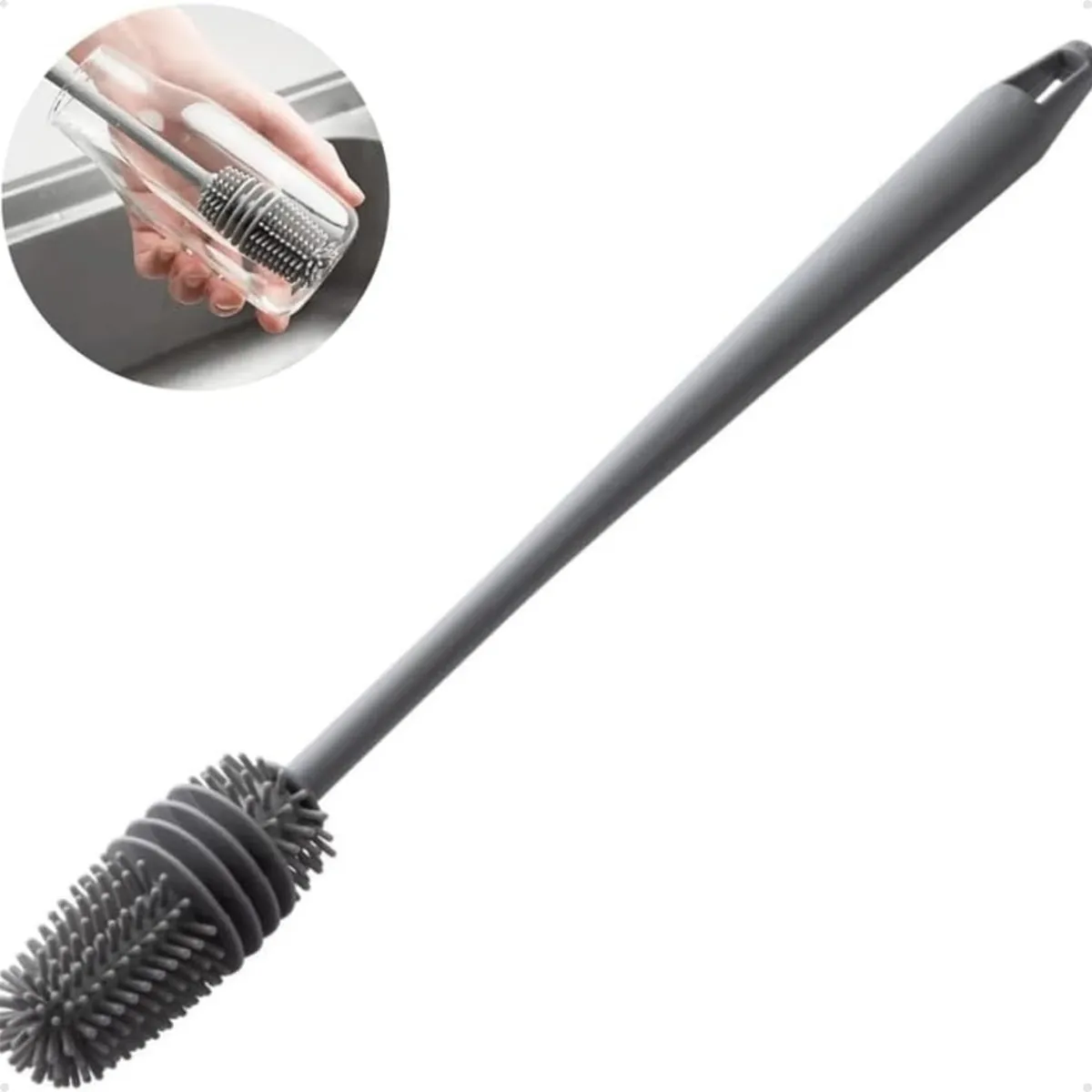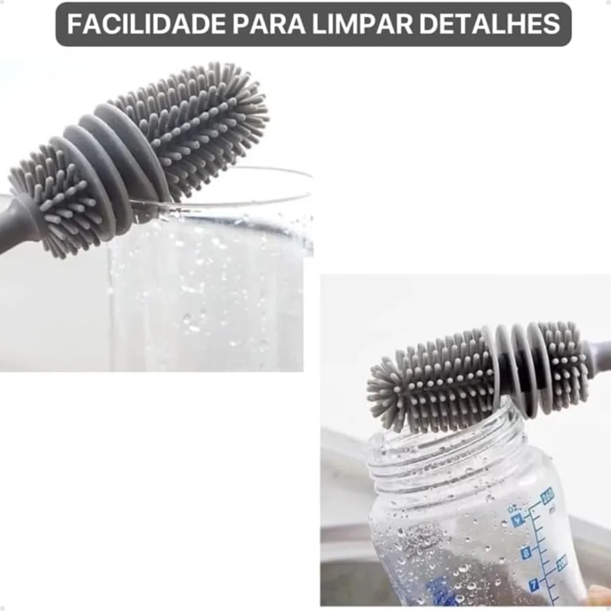 Cabo longo para alcance em áreas inacessíveis; formato funcional que garante limpeza em todas as extremidades; a escova de garrafa pode ter ponta de silicone em algumas versões, que não risca a superfície